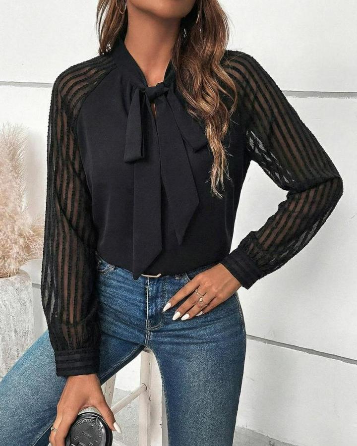 AnasayfaTüm ÜrünlerÜst GiyimBluz & TunikBluzUzun Kollu Reglan Kol Detaylı Tüllü Yakadan Bağlamalı Sandy Bluz