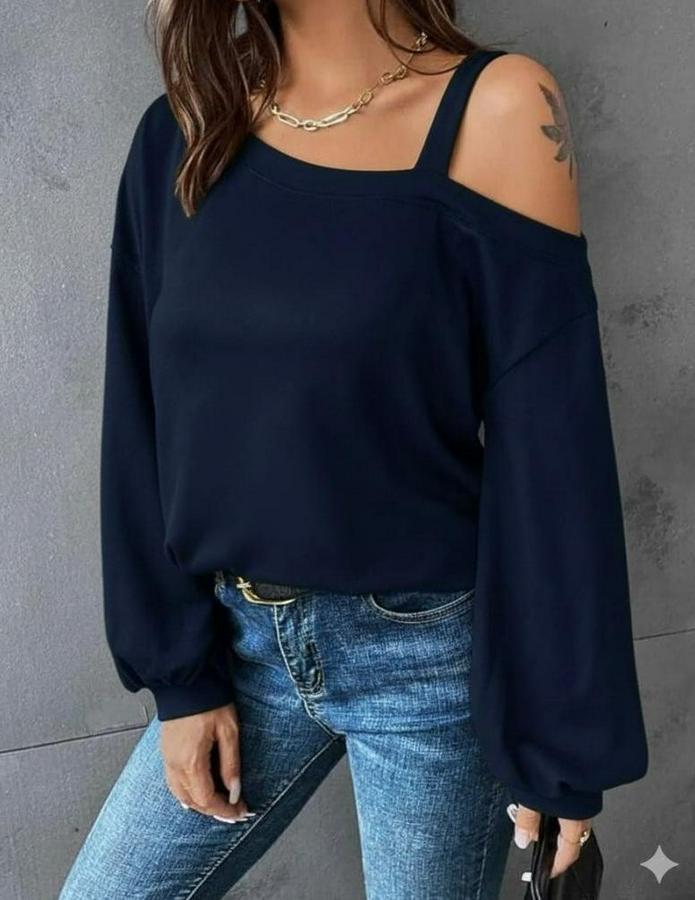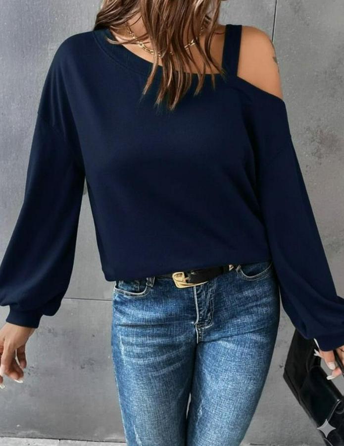 Kadın Uzun Kollu Tek Omuz Askı Detay Salaş Viskon Iki Iplik Bluz