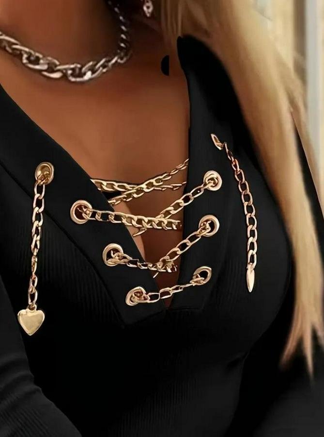 AnasayfaTüm ÜrünlerÜst GiyimBluz & TunikBluzUzun Kollu V Çapraz Zincir Detaylı Kaşkorse Bluz