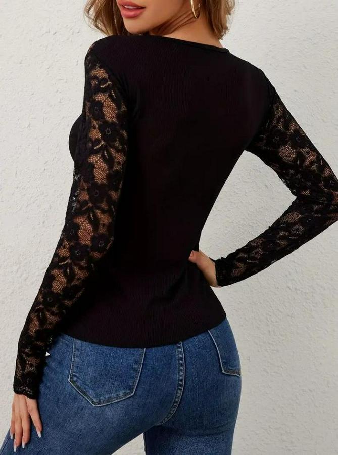 Kadın Uzun Kollu V Derin Dantel Yakalı Kaşkorse Bluz