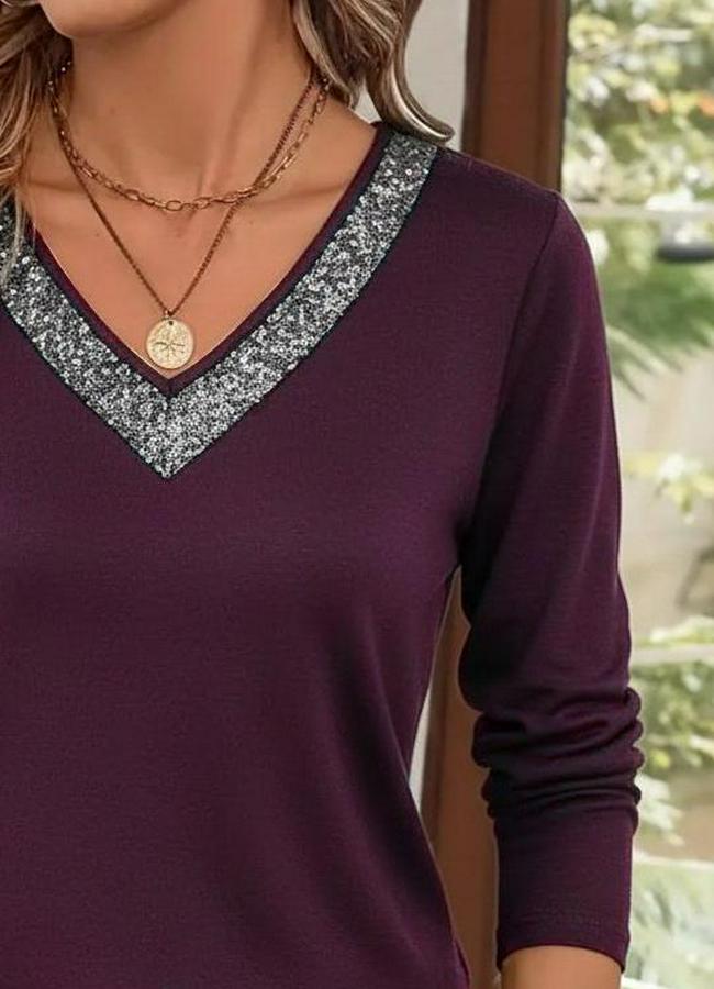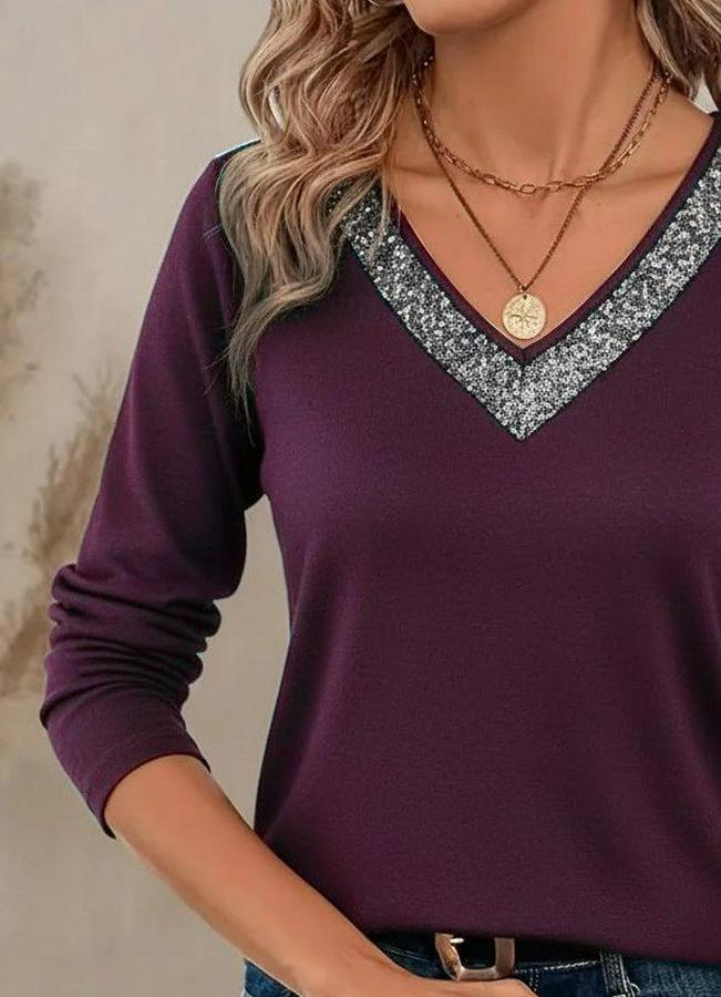 Kadın Uzun Kollu V Payet Yakalı Viskon Mürdüm Bluz
