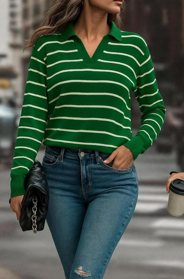 AnasayfaTüm ÜrünlerÜst GiyimBluz & TunikBluzUzun Kollu V Yaka Çizgili Triko Bluz