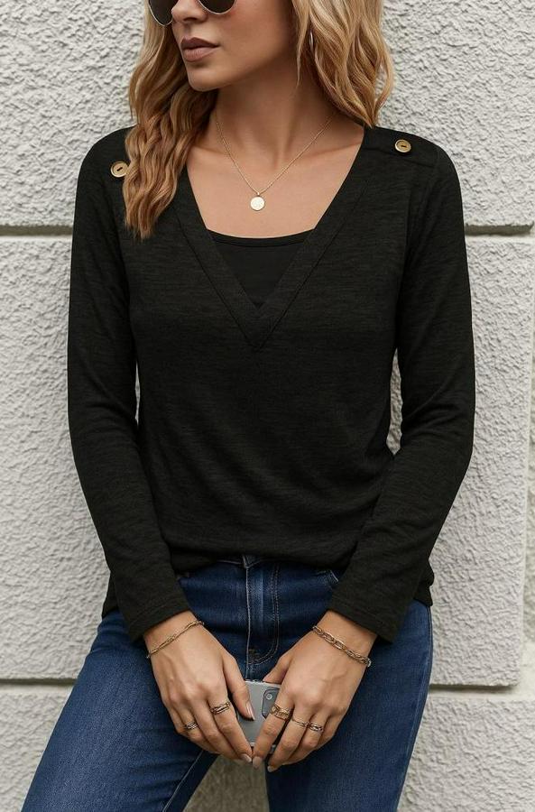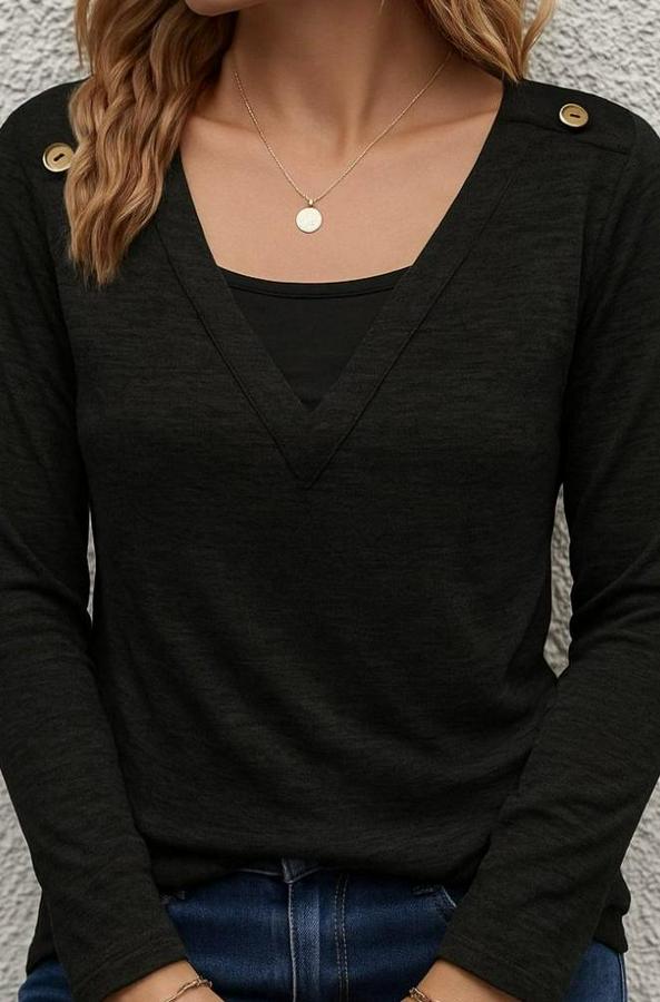 Uzun Kollu V Yaka Düğme Detaylı Yumoş Bluz