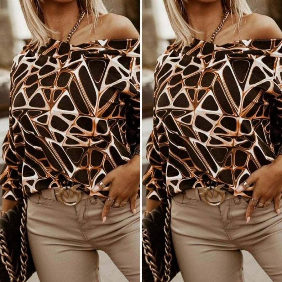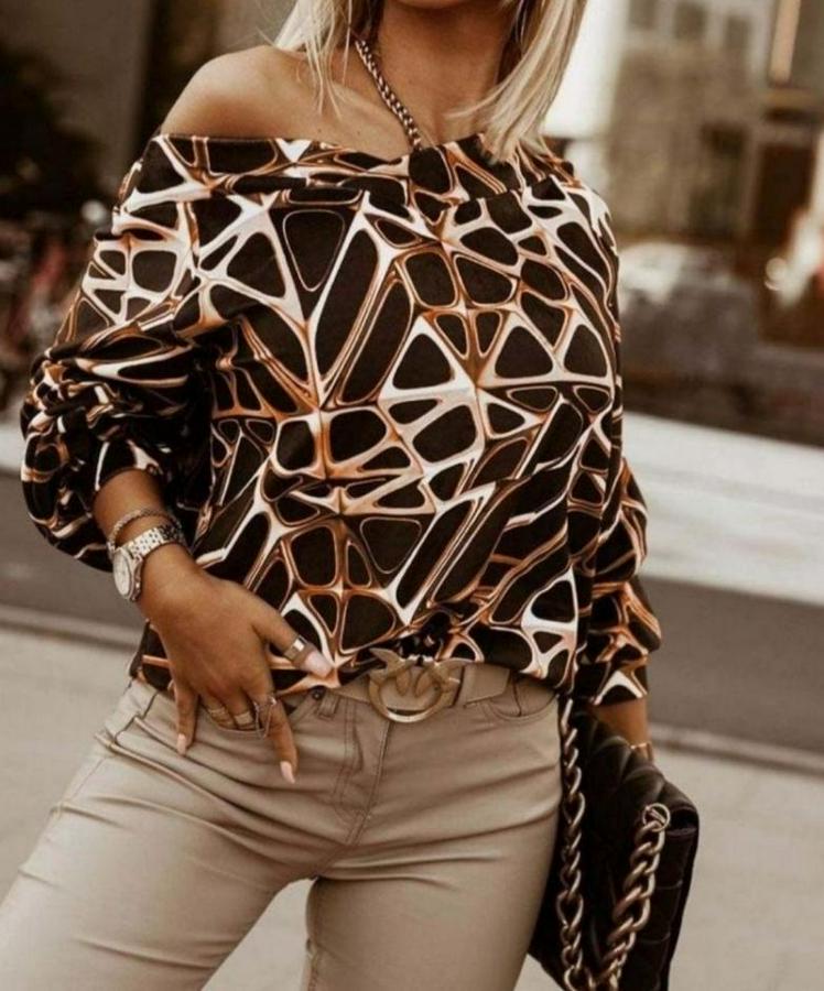 AnasayfaTüm ÜrünlerÜst GiyimBluz & TunikBluzUzun Kollu V Yaka Düşük Omuz Geometrik Desen Şardonlu Dalgıç Bluz