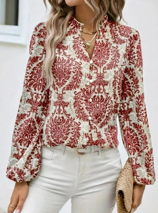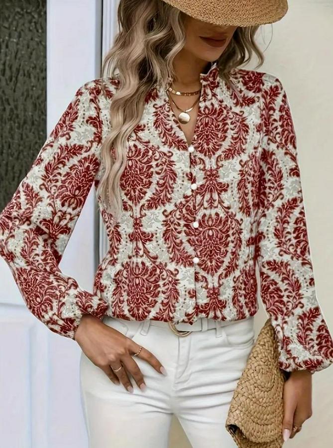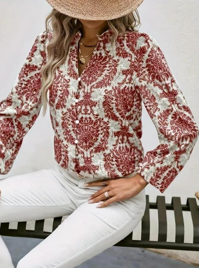 AnasayfaTüm ÜrünlerÜst GiyimBluz & TunikBluzUzun Kollu V Yakalı Desenli Önü Düğmeli Ithal Keten Bluz