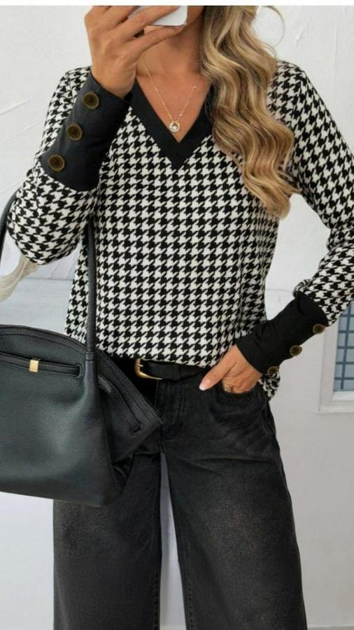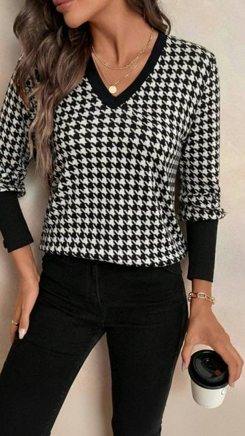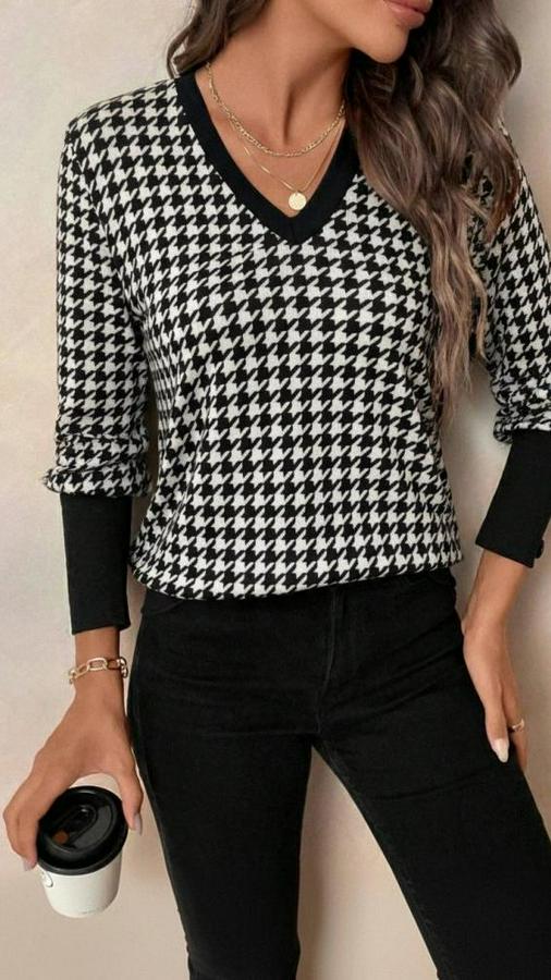 Uzun Kollu V Yakalı Desenli Süprem Bluz