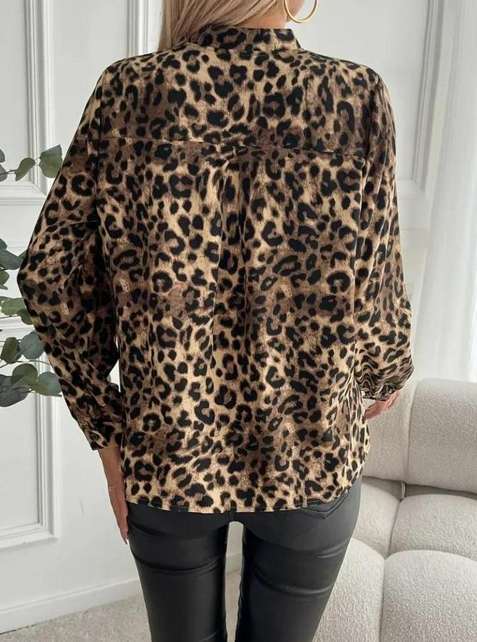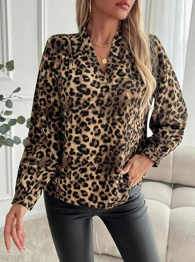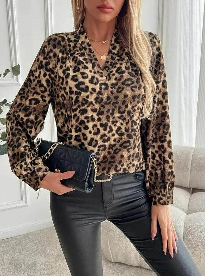 Uzun Kollu V Yakalı Modal Leopar Desenli Bluz