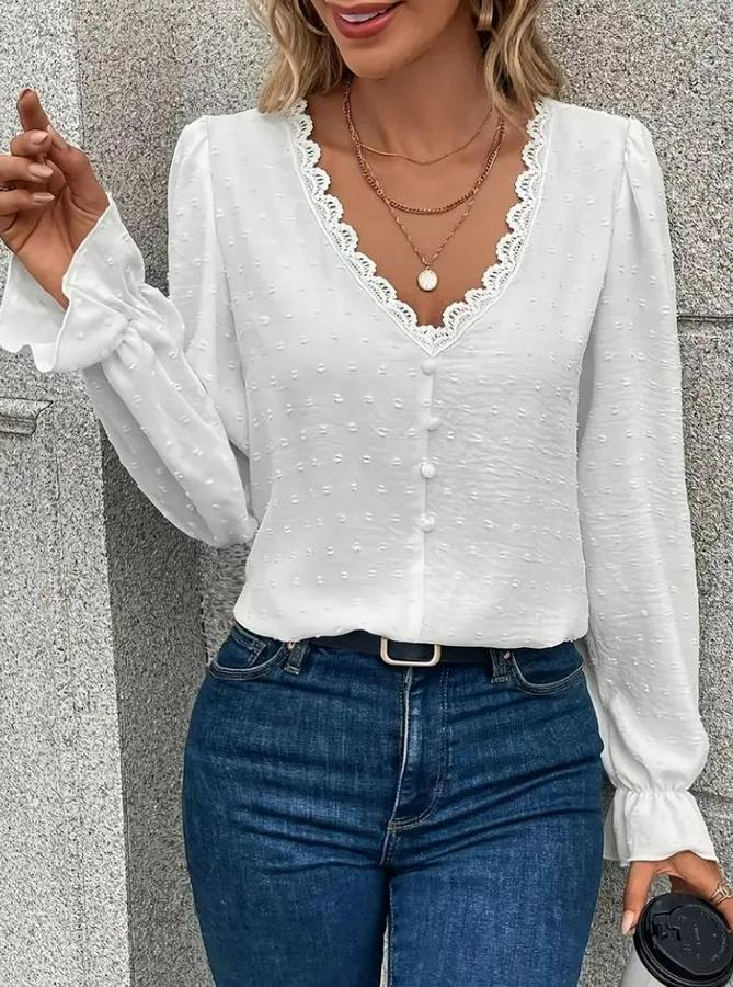 Uzun Kollu V Yakalı Önden Düğmeli Bluz