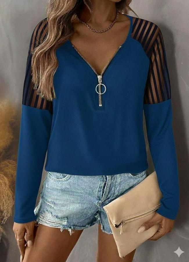 Uzun Kollu Yakadan Fermuarlı Viskon Bluz