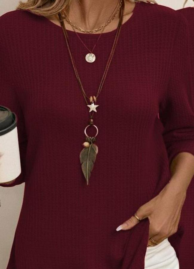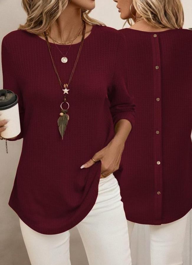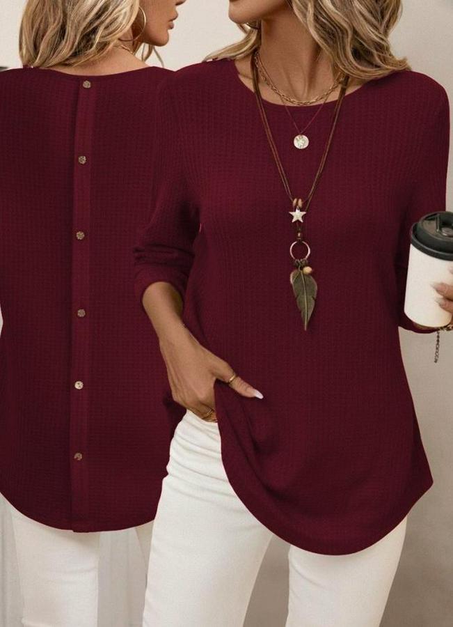 Uzun Kollu Yuvarlak Yaka Arkadan Düğmeli Waffle Bluz