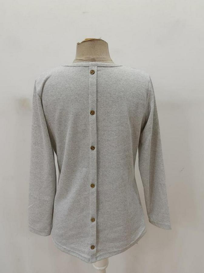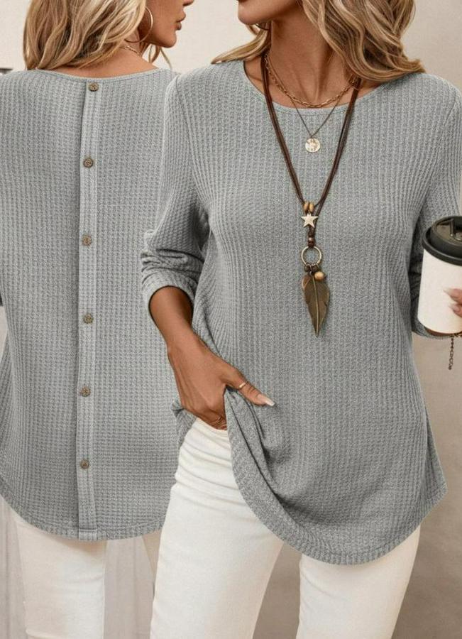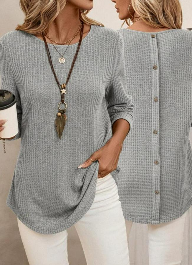 Uzun Kollu Yuvarlak Yaka Arkadan Düğmeli Waffle Bluz