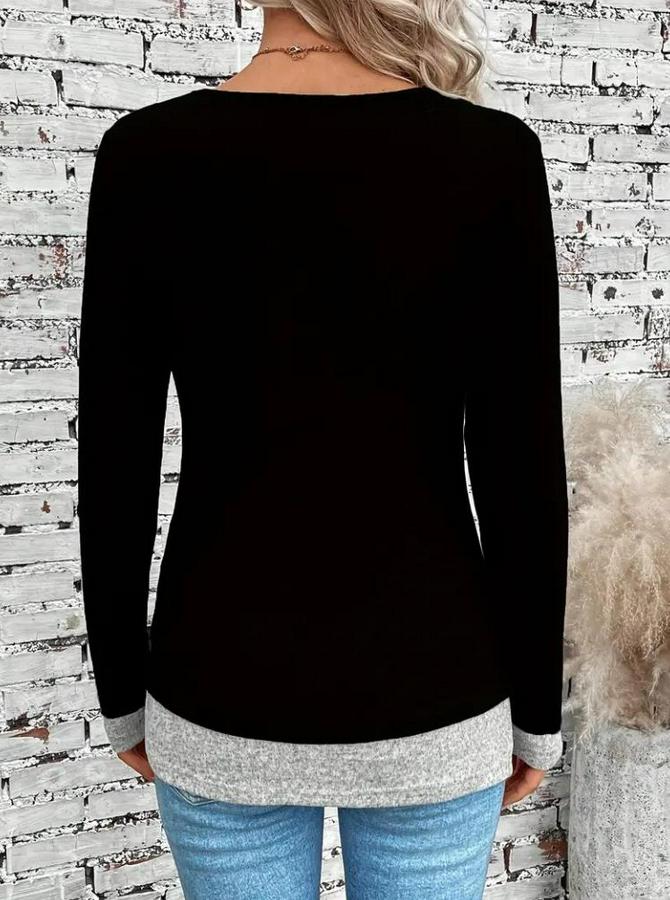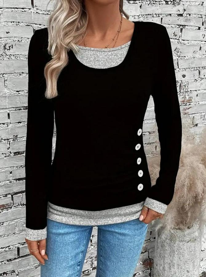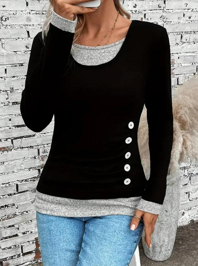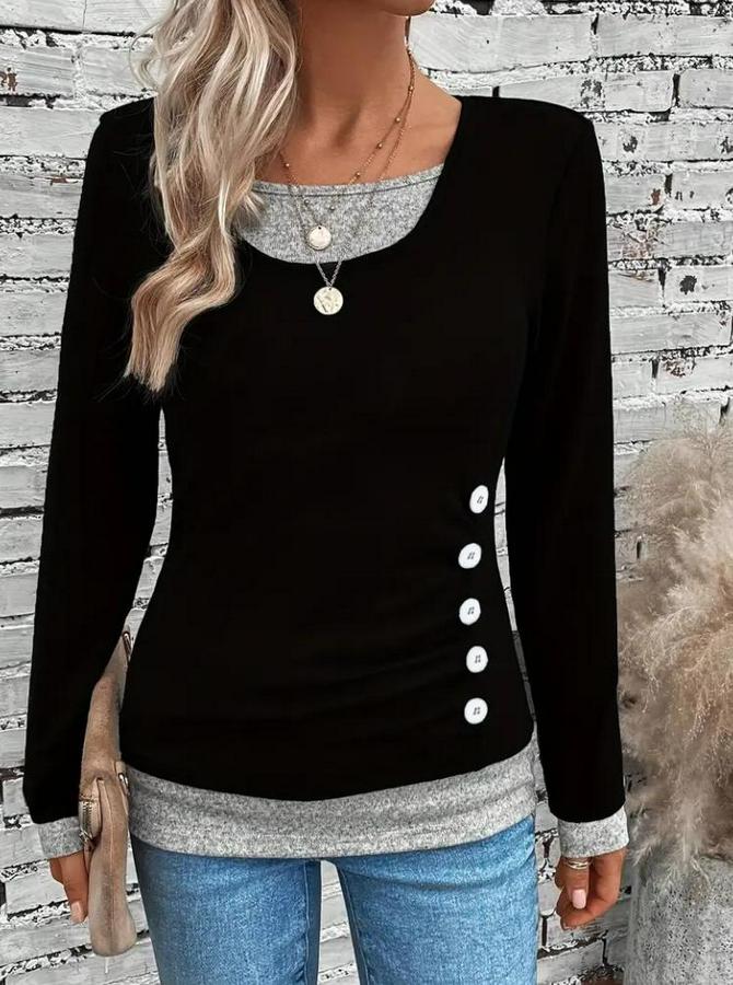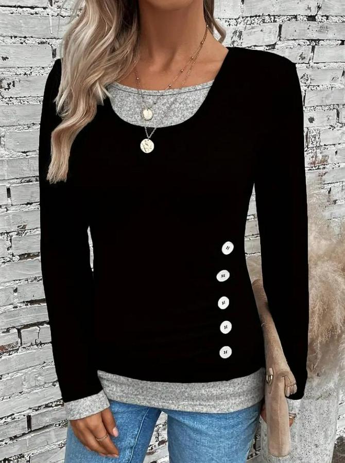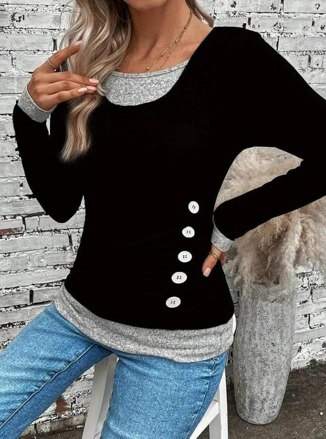 Uzun Kollu Yuvarlak Yaka Blok Renkli Yandan Düğmeli Viskon Bluz
