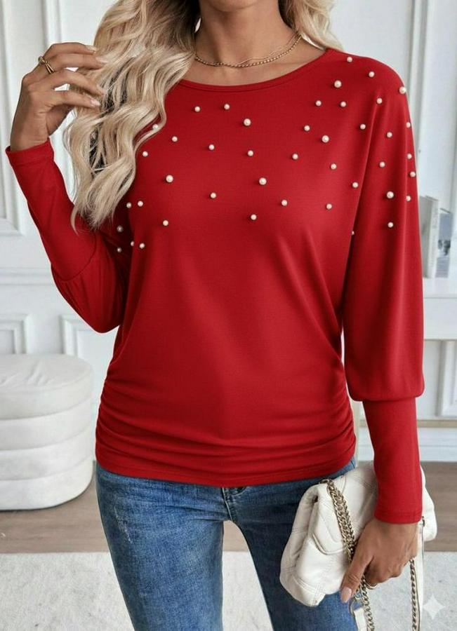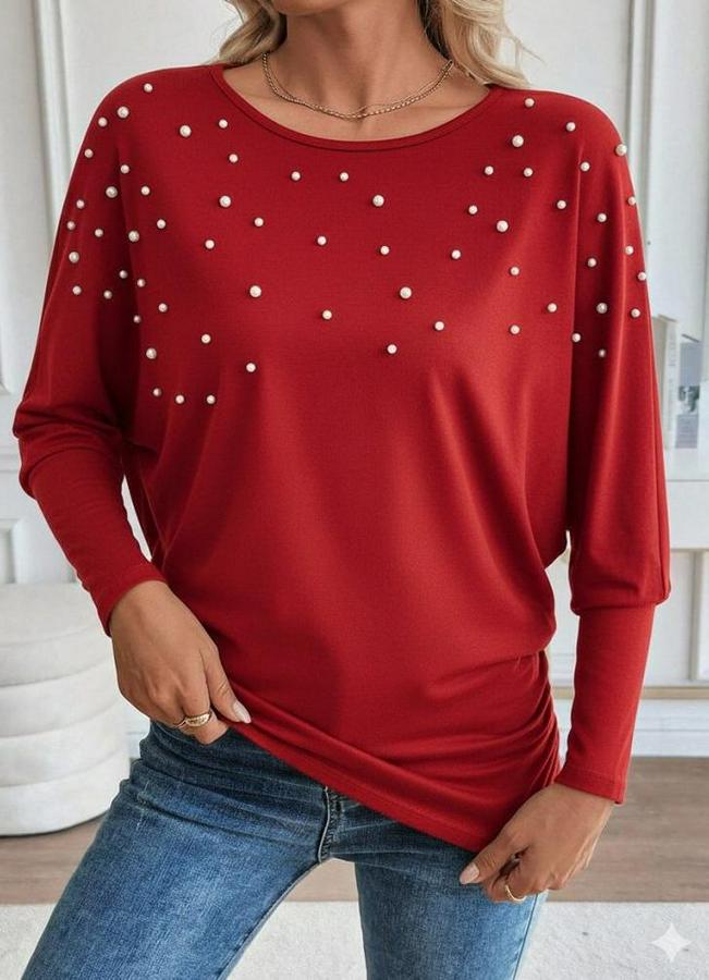 Uzun Kollu Yuvarlak Yaka Incili Viskon Bluz