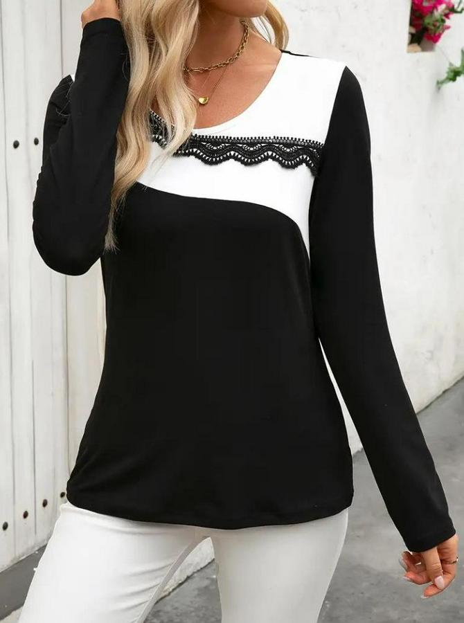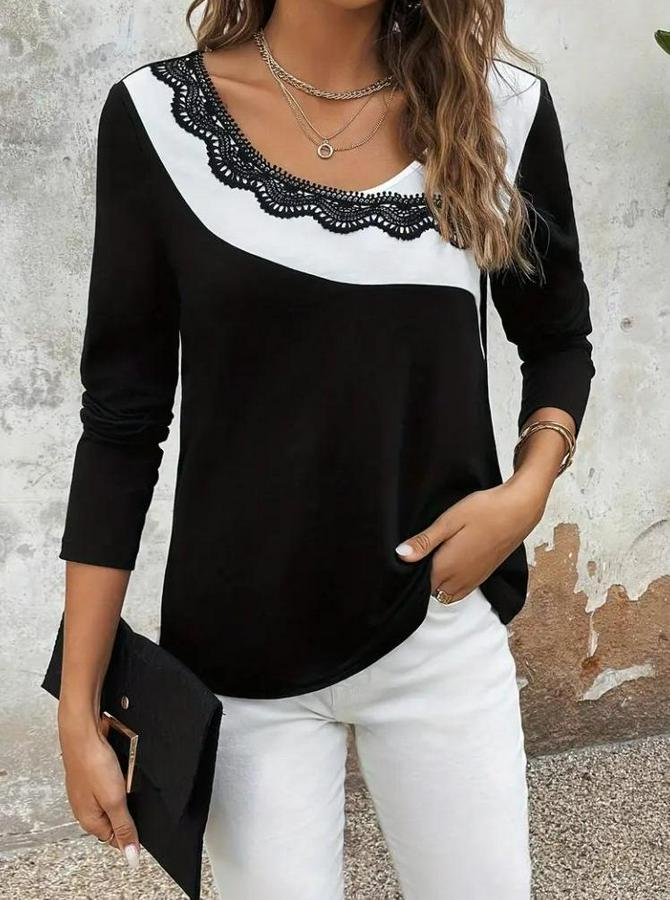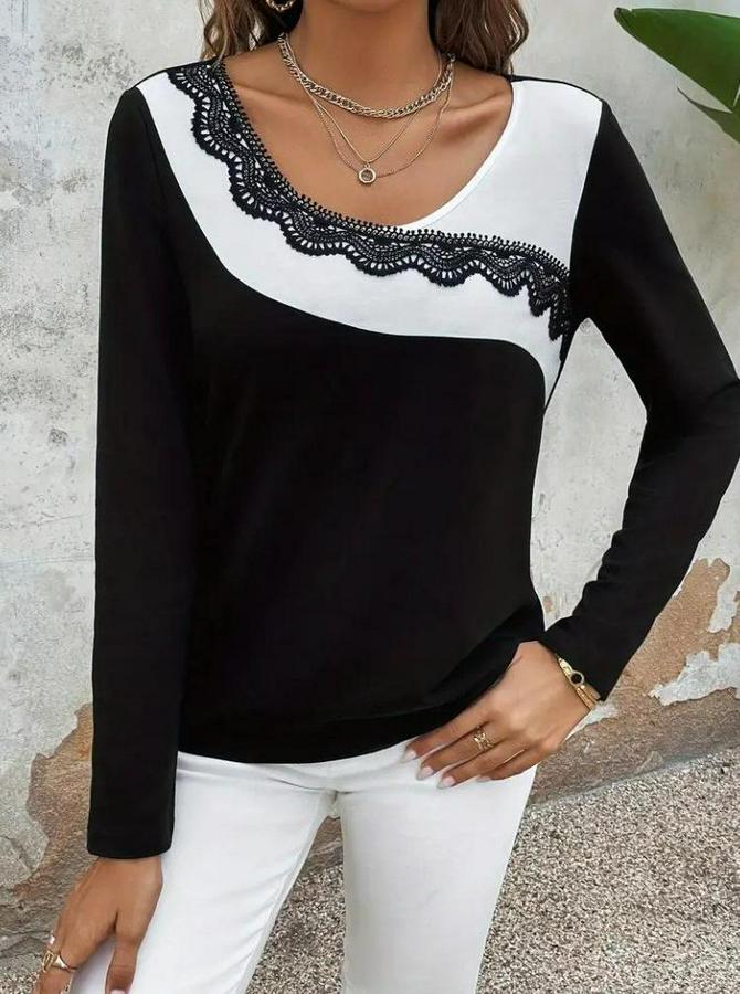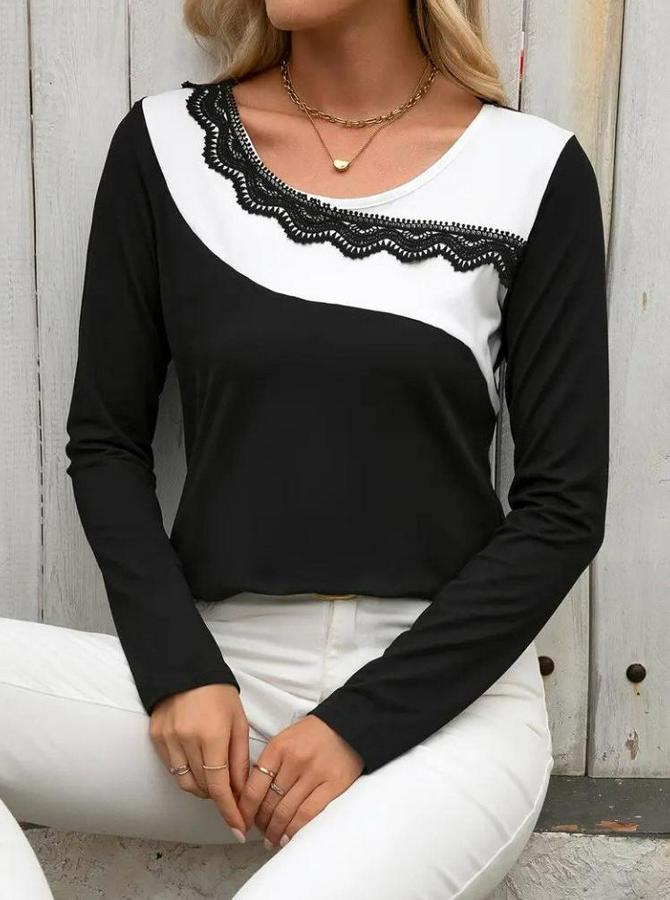 Uzun Kollu Yuvarlak Yakalı Çift Renkli Dantel Detaylı Viskon Bluz