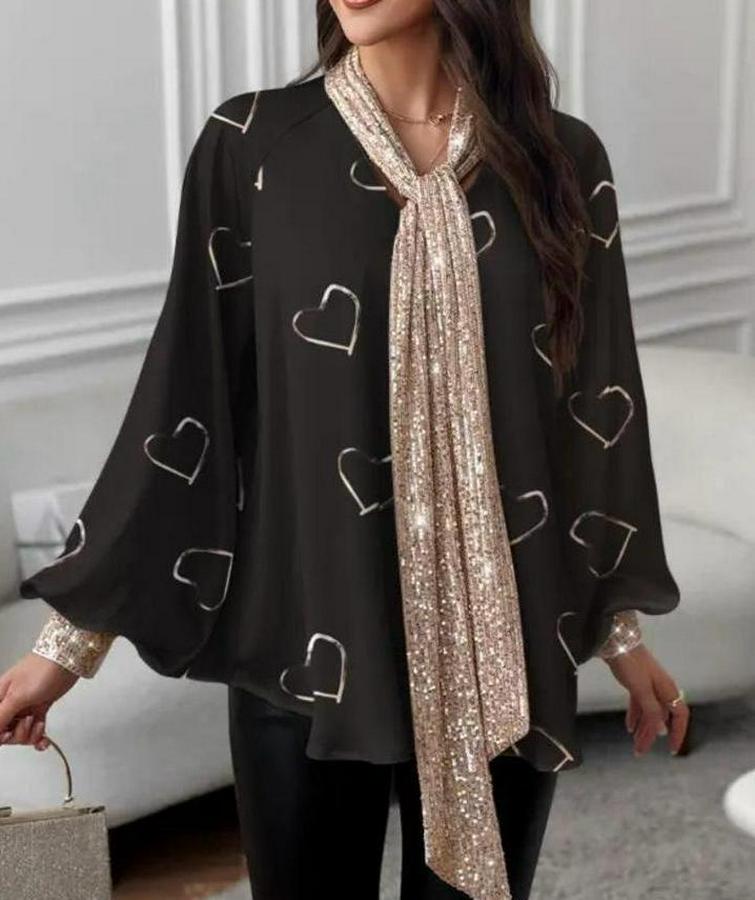 AnasayfaTüm ÜrünlerÜst GiyimBluz & TunikBluzV Yaka Kalp Baskılı Fular Dahil Fırsat Ürün Salaş Bluz