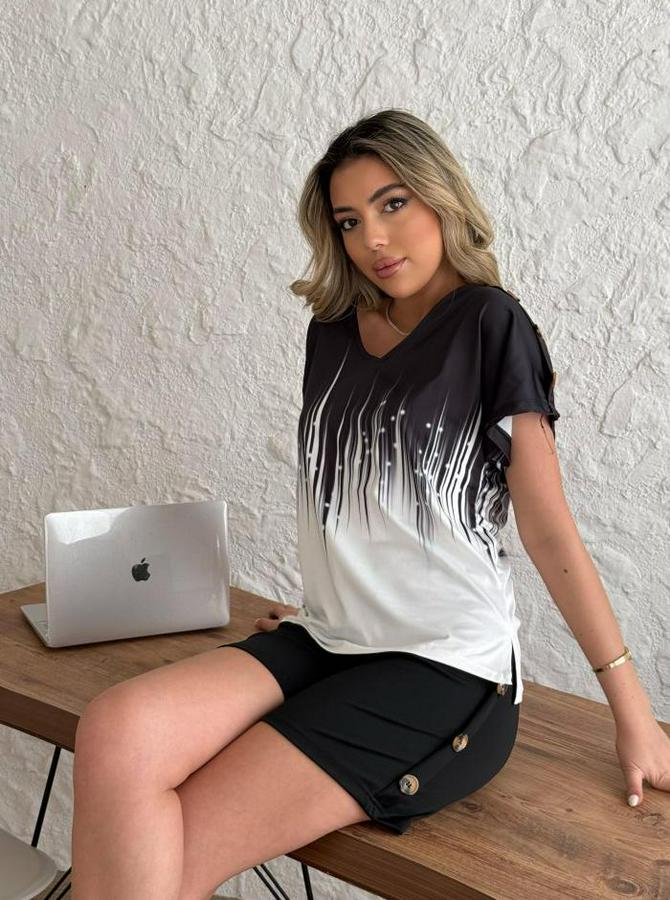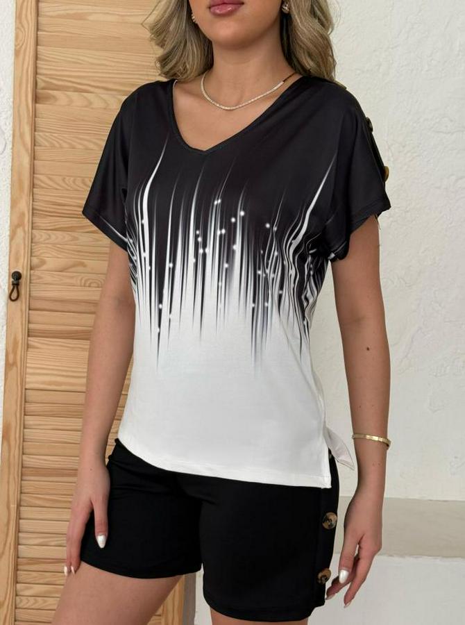 Kadın V Yaka Kısa Kol Kenarları Minik Yırtmaç Detaylı Dalgıç Bluz + Düğme Detaylı Dalgıç şort