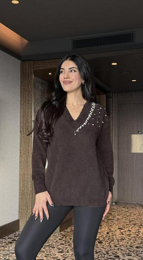 V Yaka Uzun Kollu Inci Detay Triko Bluz