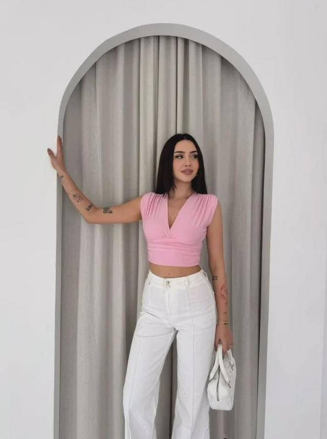 Vatkalı Kolsuz V Yaka Drapeli Crop Bluz Likralı Fit - Pembe