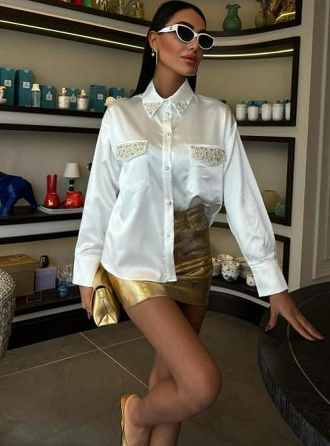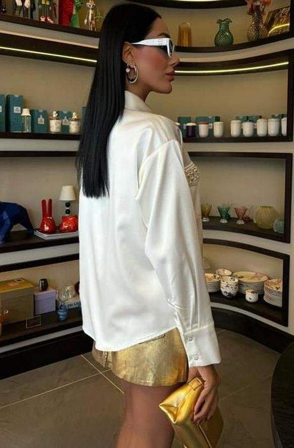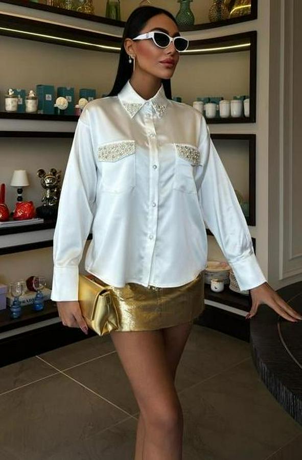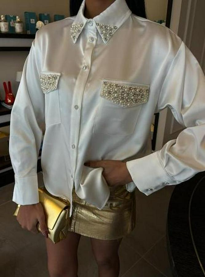 Yaka Ve Cep İnci Taşlı Saten Gömlek 3423
