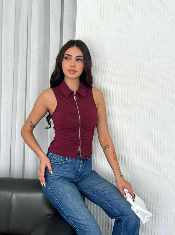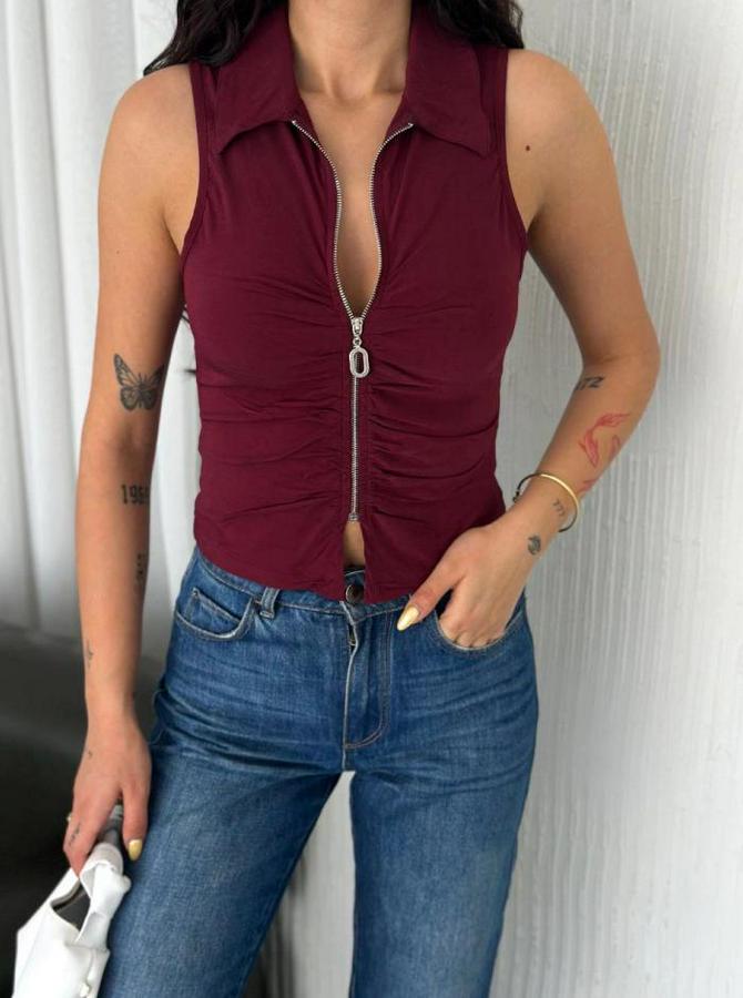 Yakalı Tam Fermuarlı Kolsuz Bluz - Bordo