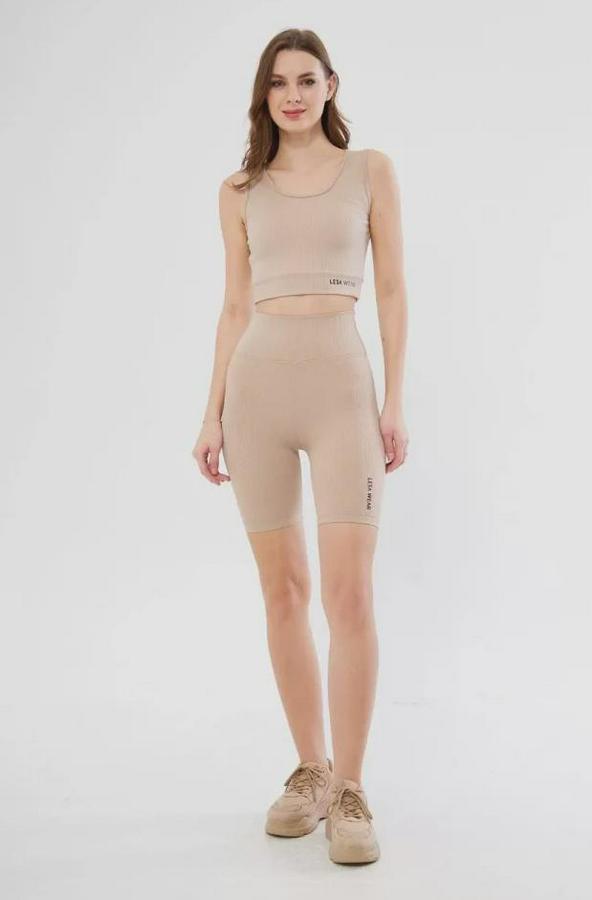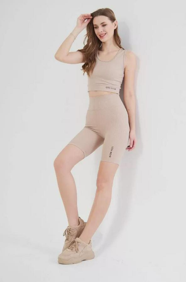 Yüksek Bel Fitilli Croplu Biker Şortlu Takım - Bej