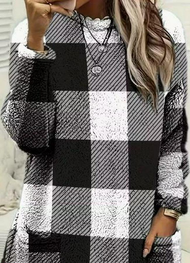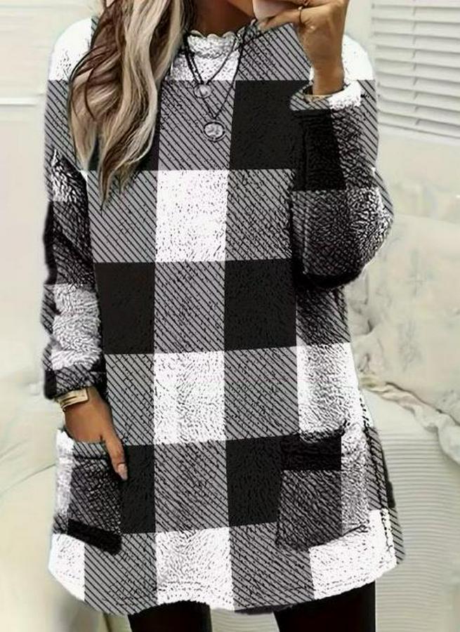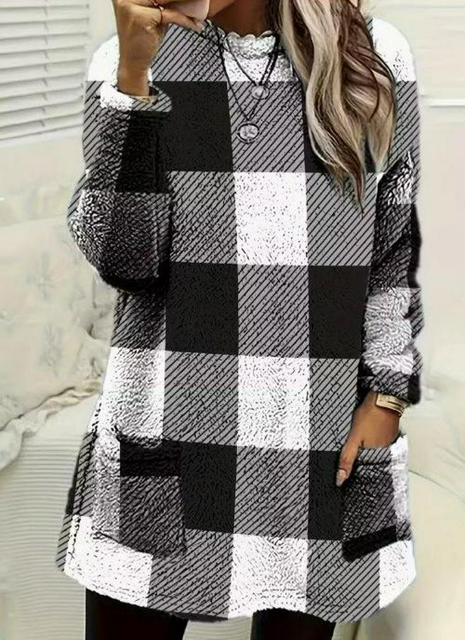 Uzun Kollu Yarı Balıkçı Yakalı Cep Detaylı Ekoseli Dokuma Tunik