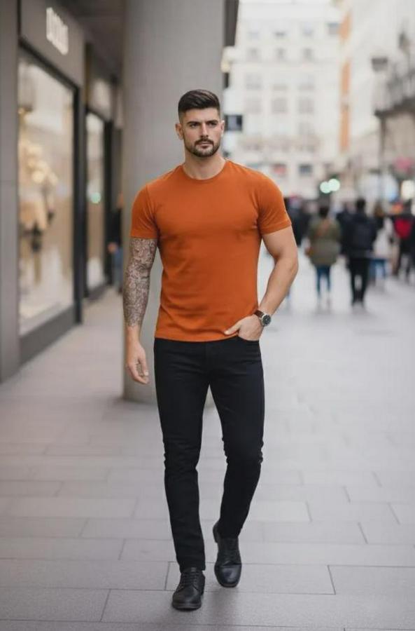Erkek T-Shirt Bisiklet Yaka Slim Fit Dar Kesim Likralı Tişört Günlük Basic Body - Koyu Turuncu
