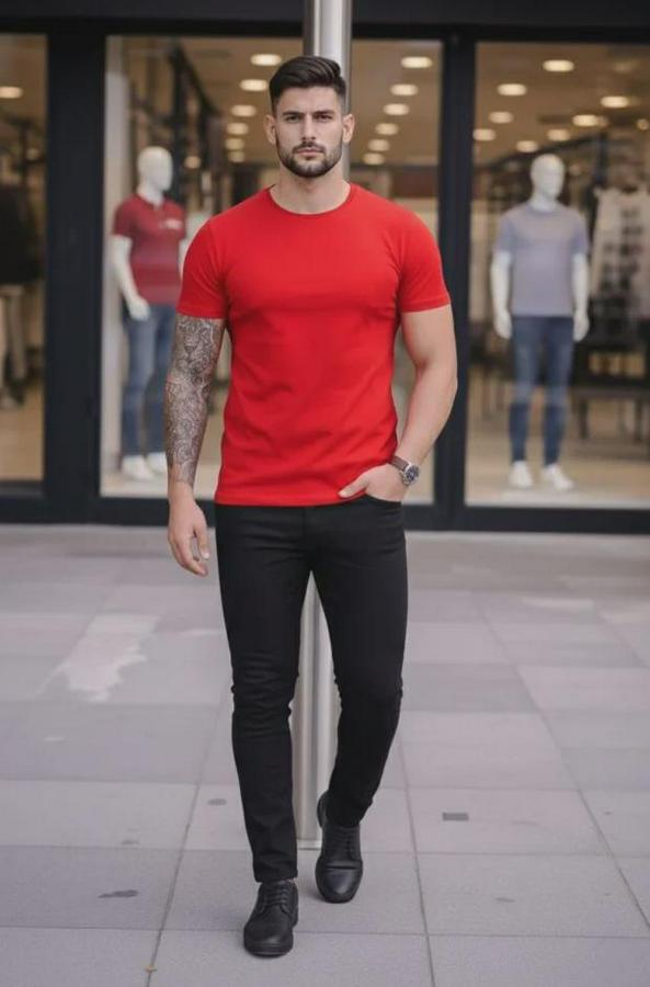 Erkek T-Shirt Bisiklet Yaka Slim Fit Dar Kesim Likralı Tişört Günlük Basic Body - Kırmızı