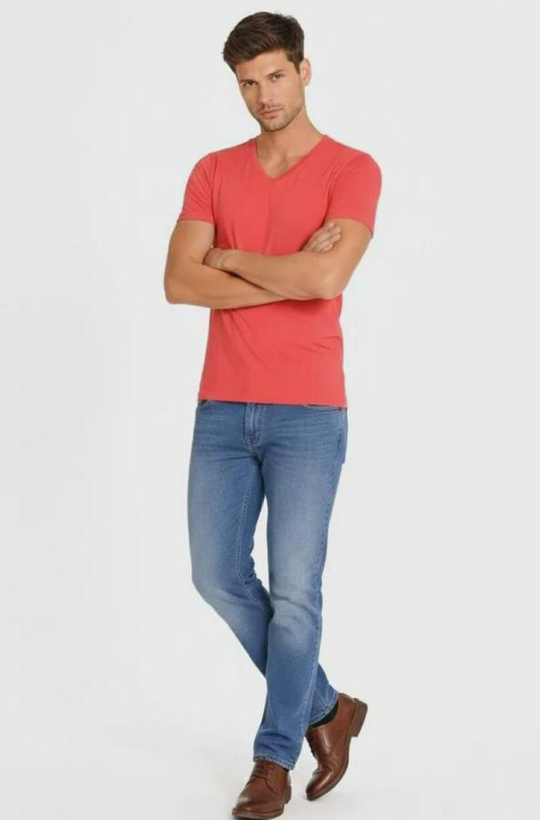 Erkek T-Shirt V Yaka Slim Fit Dar Kesim Likralı Tişört Günlük Basic Body - Nar Çiçeği