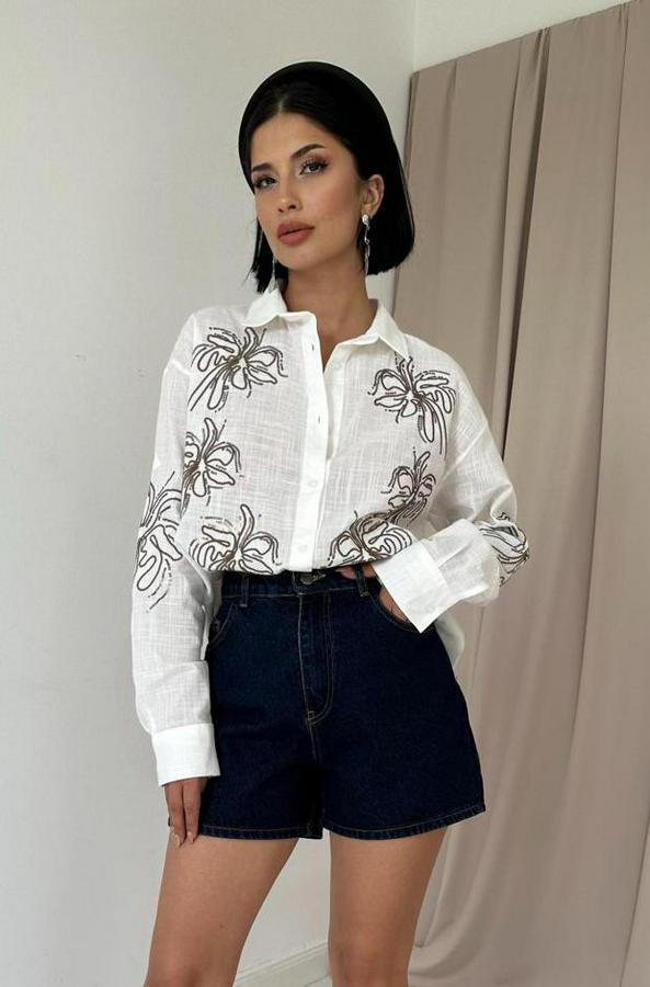 AnasayfaTüm ÜrünlerÜst GiyimGömlekBeyaz Flamlı Keten Nakışlı Pullu Gömlek