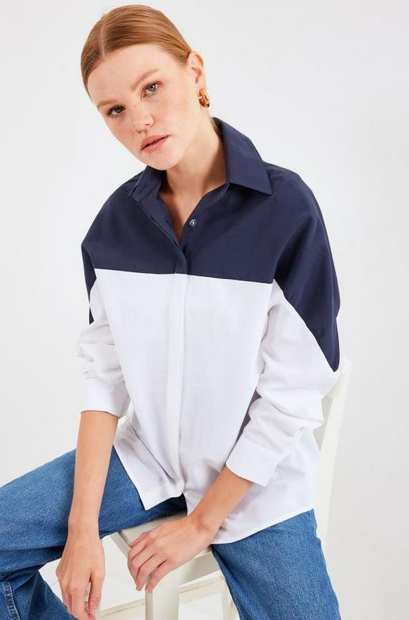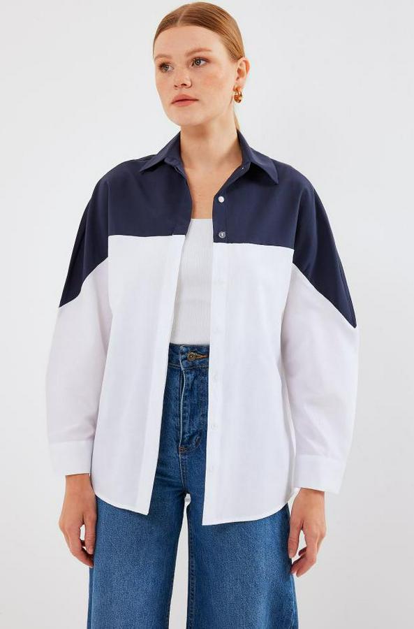 20221 Blok Renkli Oversize Gömlek - Lacivert