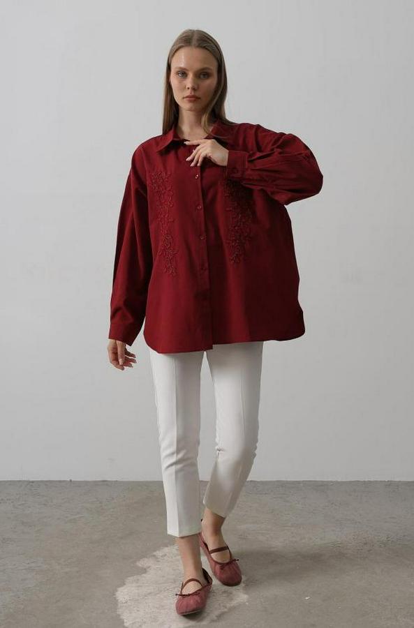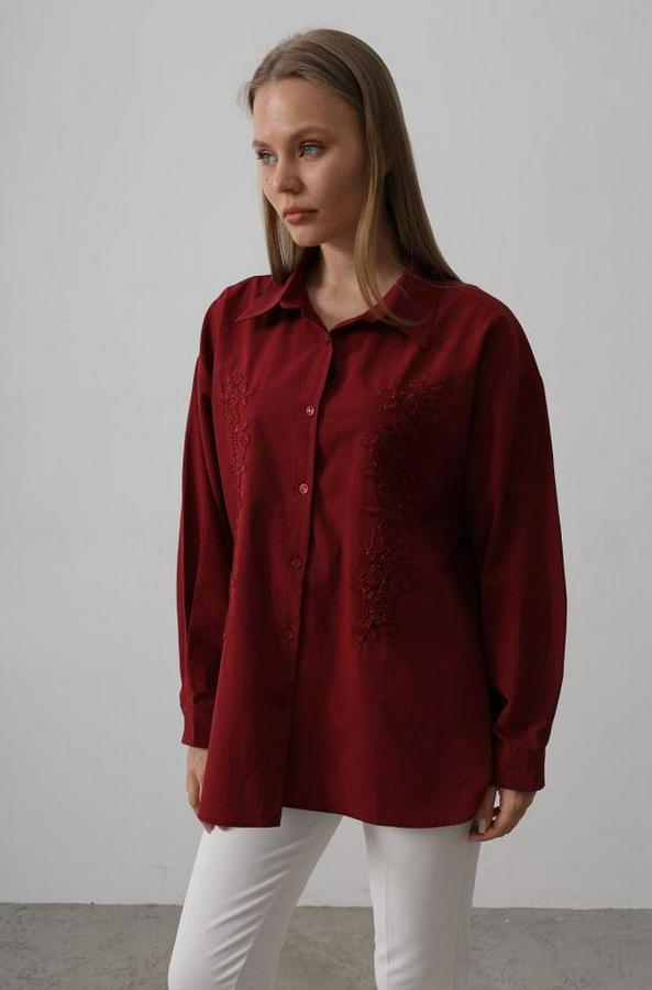 Boncuk Nakış Detaylı Uzun Gömlek - Bordo
