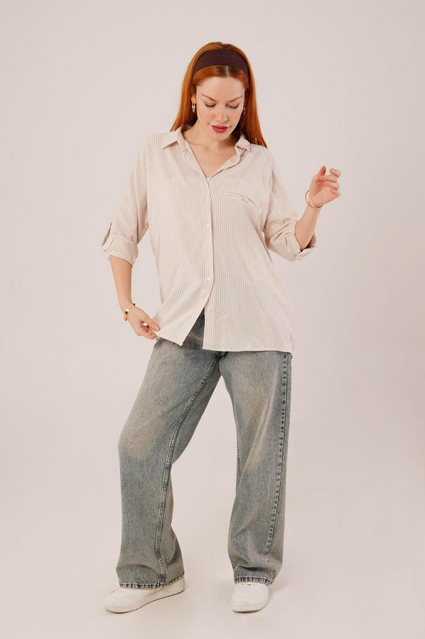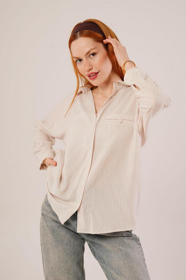 AnasayfaTüm ÜrünlerÜst GiyimGömlekCep Detay Çizgili Oversize Krem Gömlek