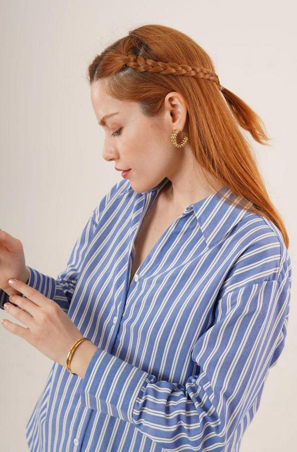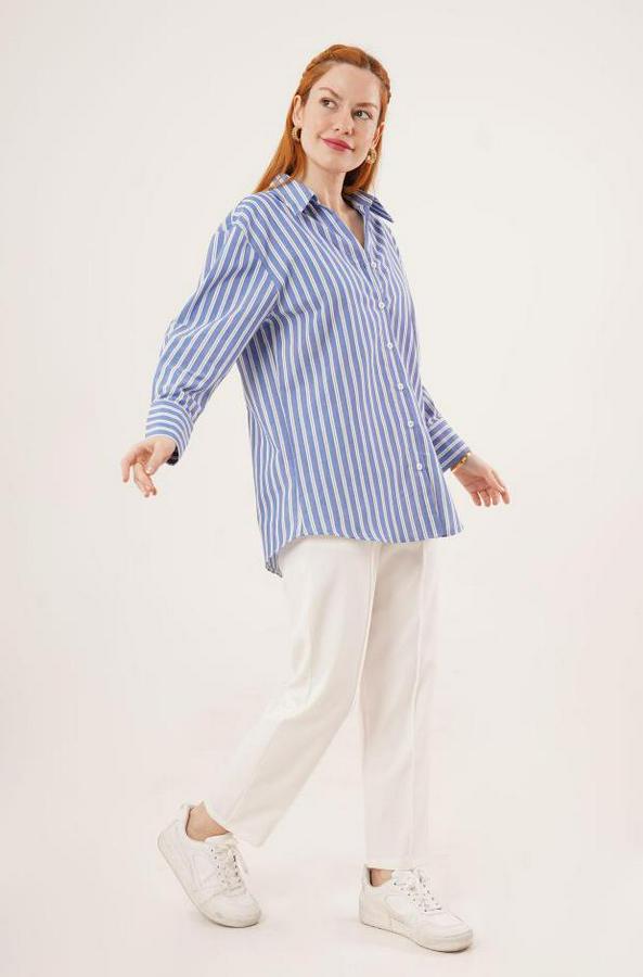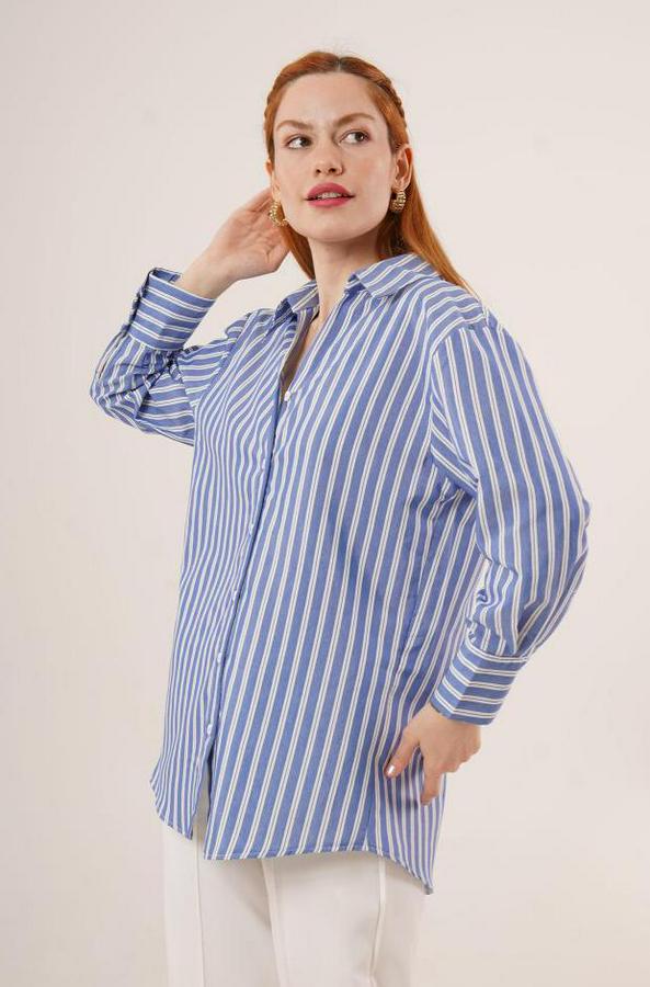 AnasayfaTüm ÜrünlerÜst GiyimGömlekÇift Çizgi Geçişli Düğmeli Mavi Gömlek