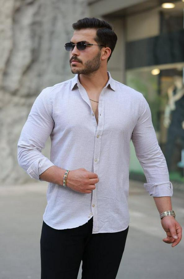 Erkek çizgi Desenli Uzun Kollu Pamuklu Keten Gömlek
