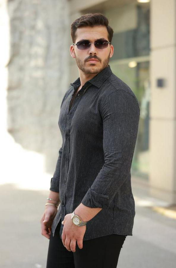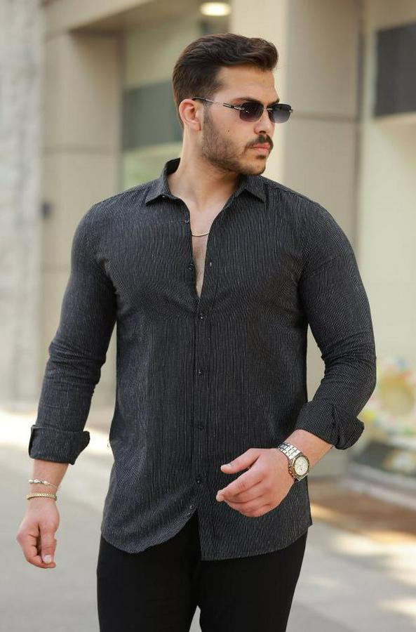 Erkek çizgi Desenli Uzun Kollu Pamuklu Keten Gömlek