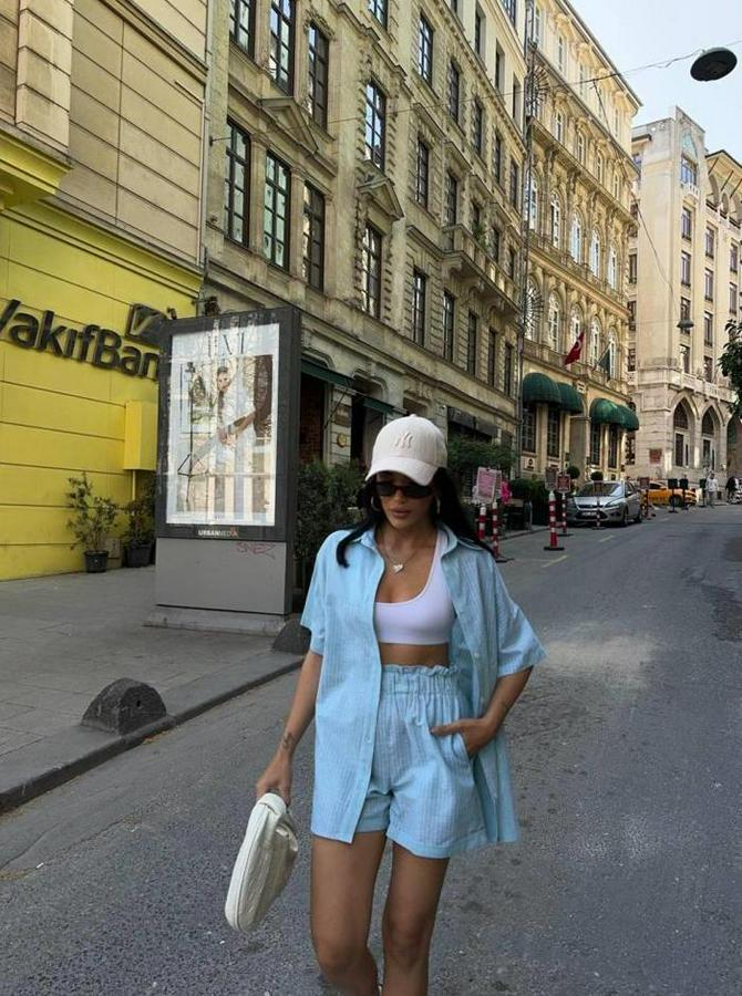 Çizgili Parçali Keten Gömlek-Şort Takim