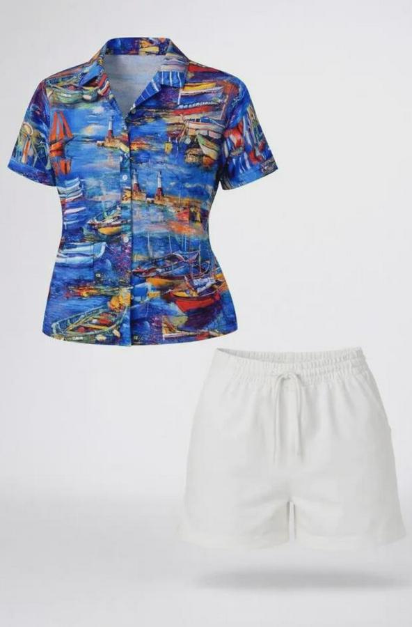 Deniz Temalı Desenli Kısa Kol Gömlek Şort Takım Yazlık Rahat Kalıp