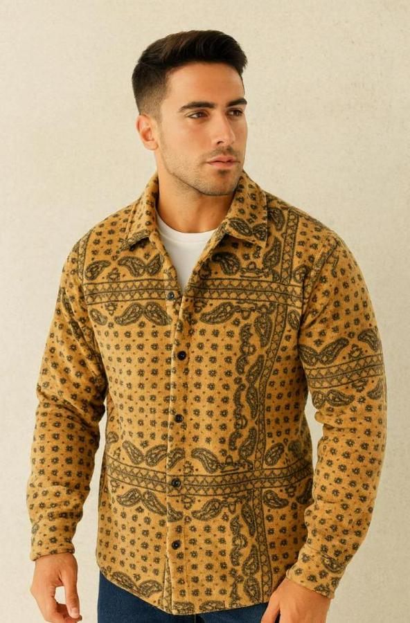 Erkek Desenli Düğmeli Polar Gömlek – Hardal Paisley Desen Yakalı, Uzun Kollu, Oversize Rahat Kalıp - Sarı