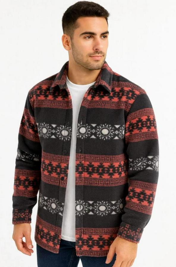 AnasayfaTüm ÜrünlerÜst GiyimGömlekDesenli Polar Gömlek – Etnik Şerit Desen Yakalı, Uzun Kollu, Düğmeli, Oversize Rahat Kalıp