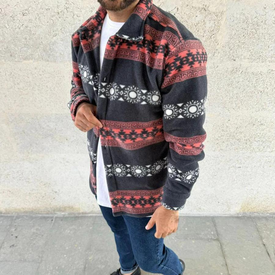 Desenli Polar Gömlek – Etnik Şerit Desen Yakalı, Uzun Kollu, Düğmeli, Oversize Rahat Kalıp