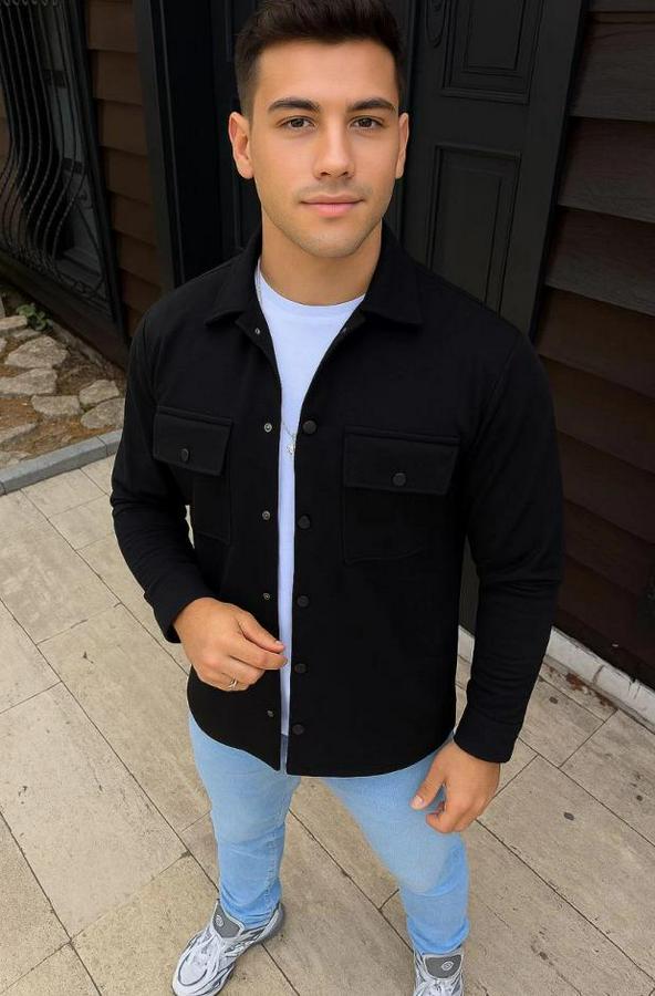 Erkek Diagonal Kumaş Cepli Çıtçıtlı Uzun Kollu, Gömlek Oversize Rahat Kalıp Günlük Şık Stil - Siyah