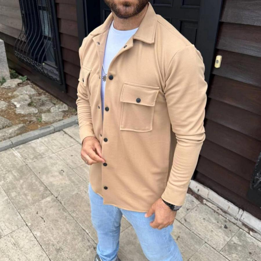 Erkek Diagonal Kumaş Cepli Çıtçıtlı Uzun Kollu, Gömlek Oversize Rahat Kalıp Günlük Şık Stil - Bej