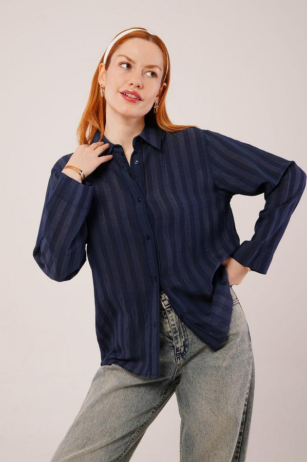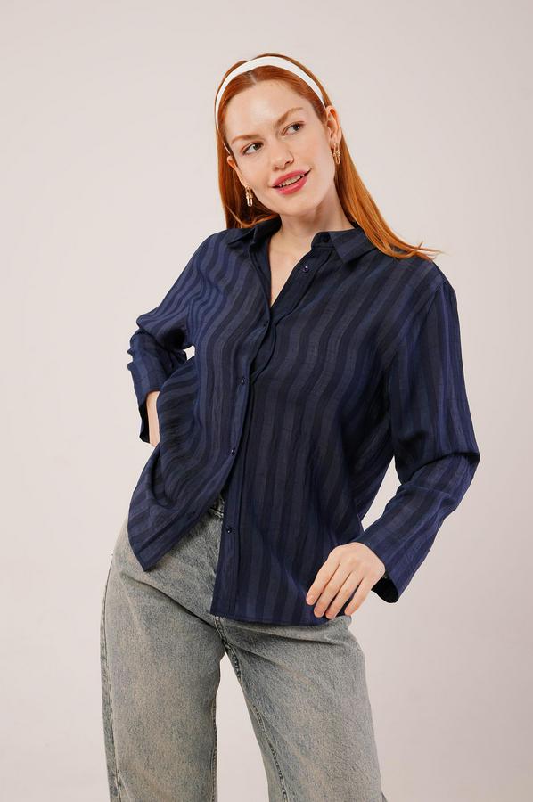 Düğmeli Ve Çizgi Detaylı Lacivert Gömlek