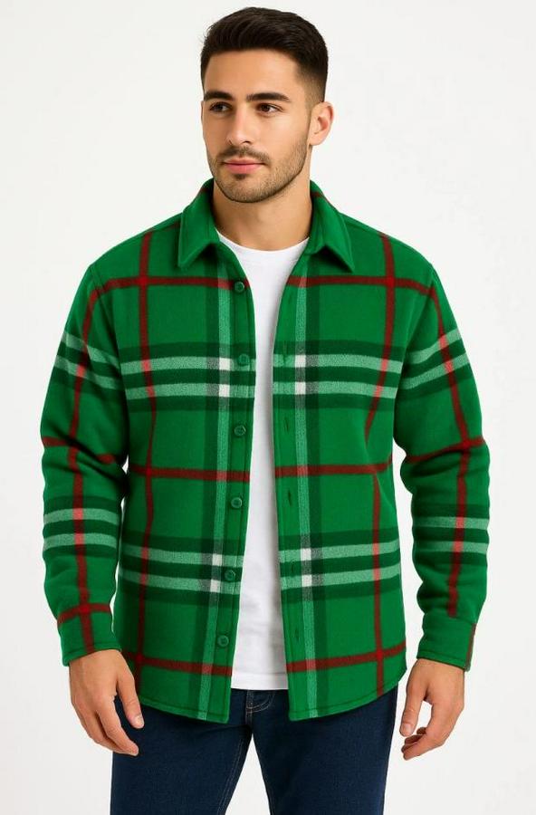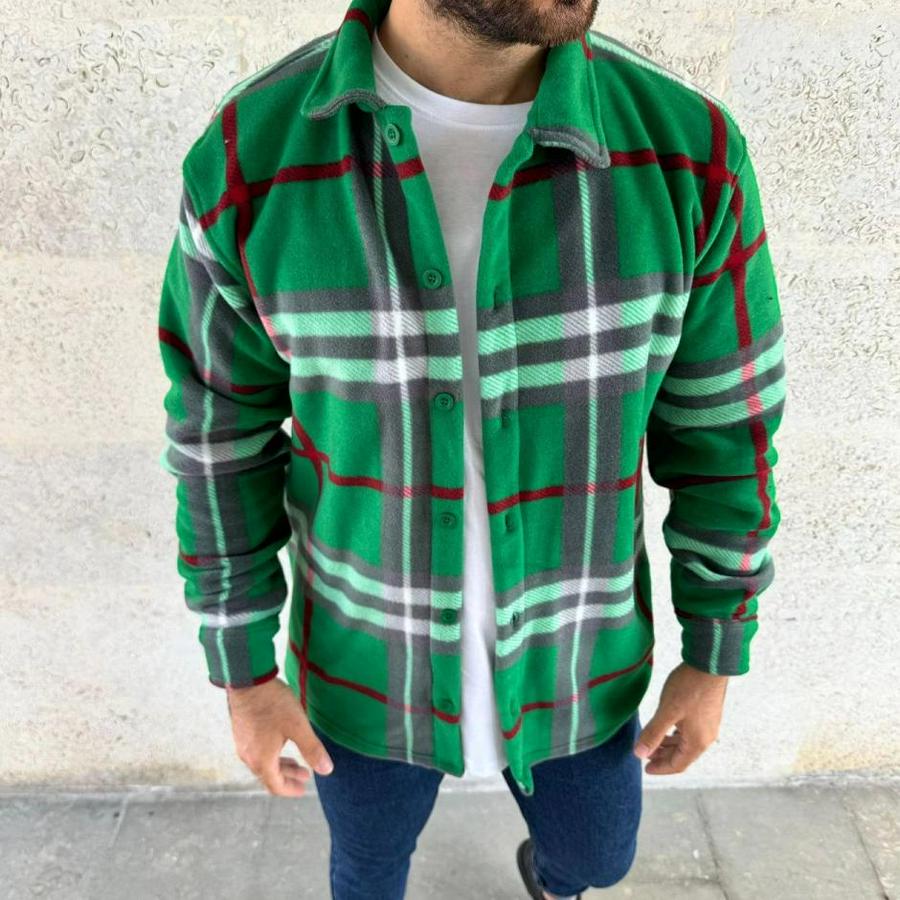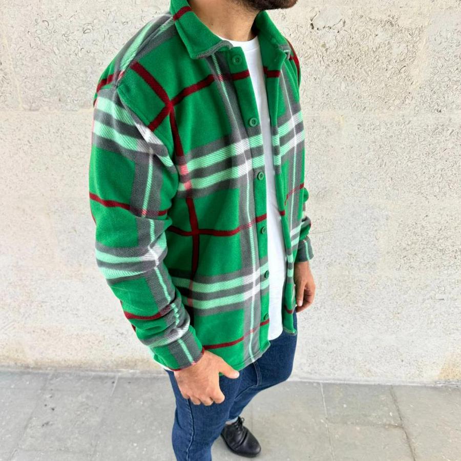 Erkek Ekose Desenli Düğmeli Polar Yakalı Uzun Kollu Gömlek Oversize Rahat Kalıp - Yeşil
