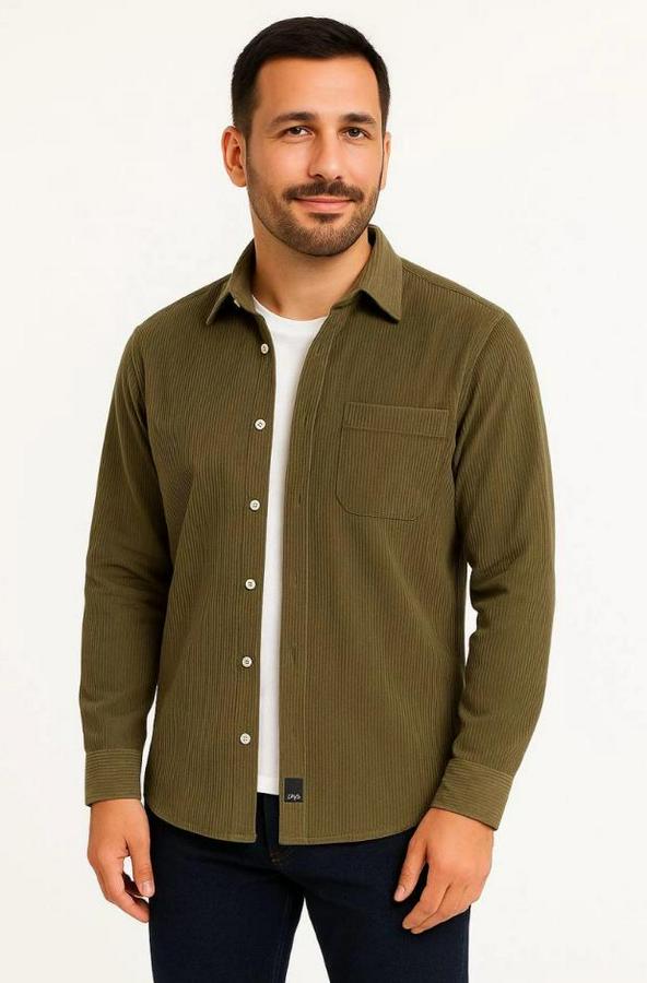 Erkek Fitilli Kadife Cepli Gömlek Oversize Rahat Kalıp - Haki