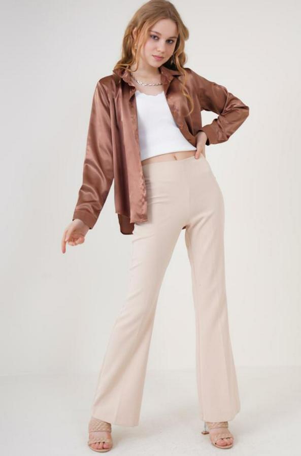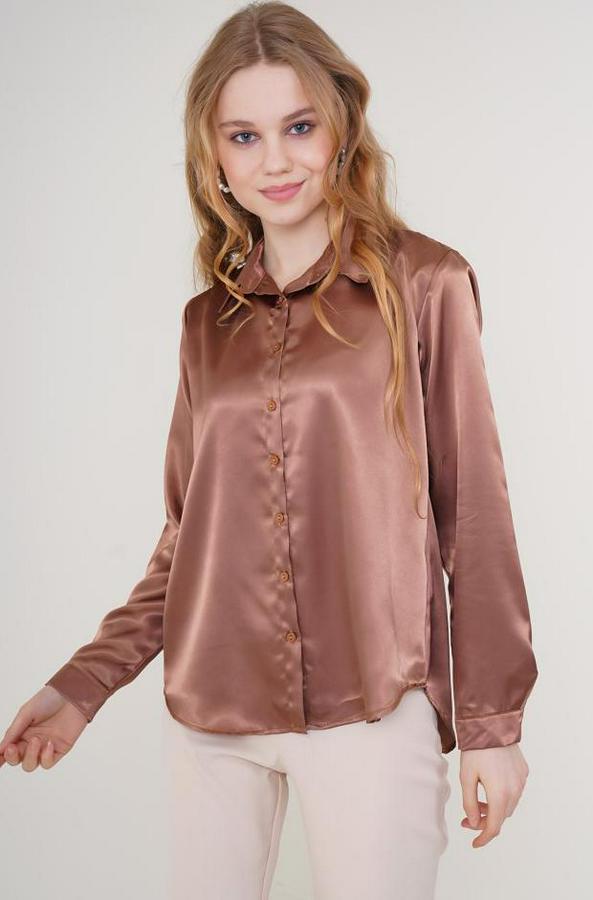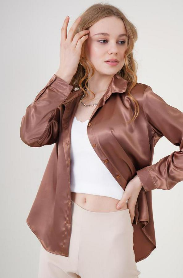 3964 Hafif Dökümlü Saten Gömlek - Taba