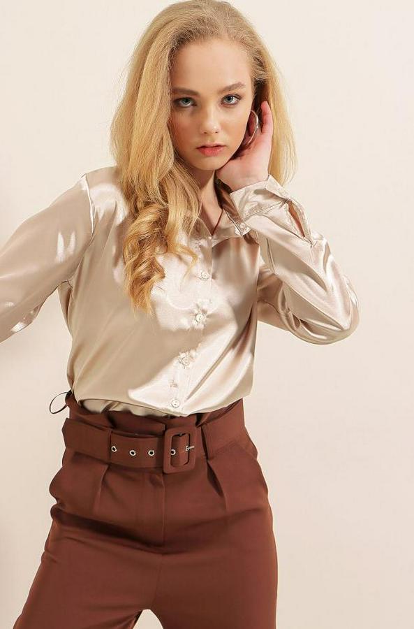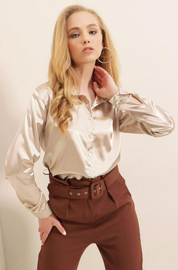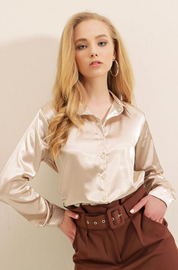 3964 Hafif Dökümlü Saten Gömlek - Bej