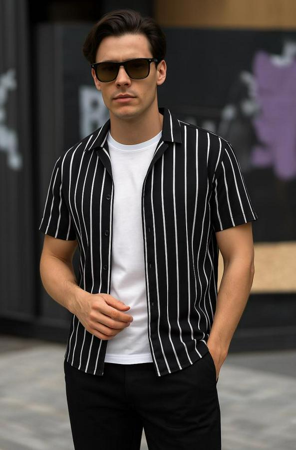 Erkek Kısa Kollu Beyaz çizgi Desenli örme Kumaş Pamuklu Gömlek