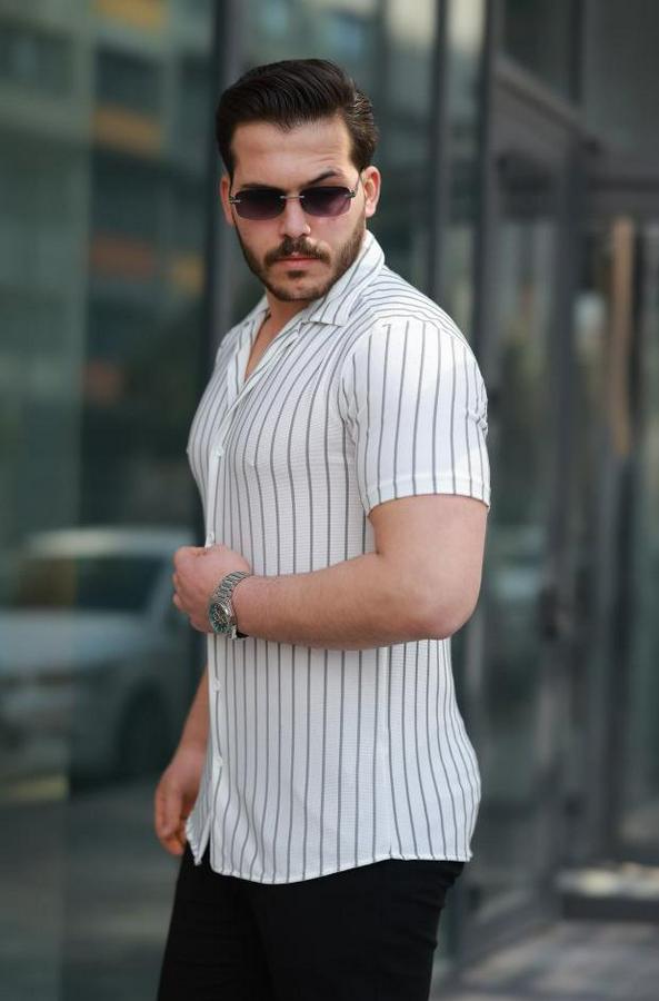 Erkek Kısa Kollu Gri çizgi Desenli örme Kumaş Pamuklu Gömlek